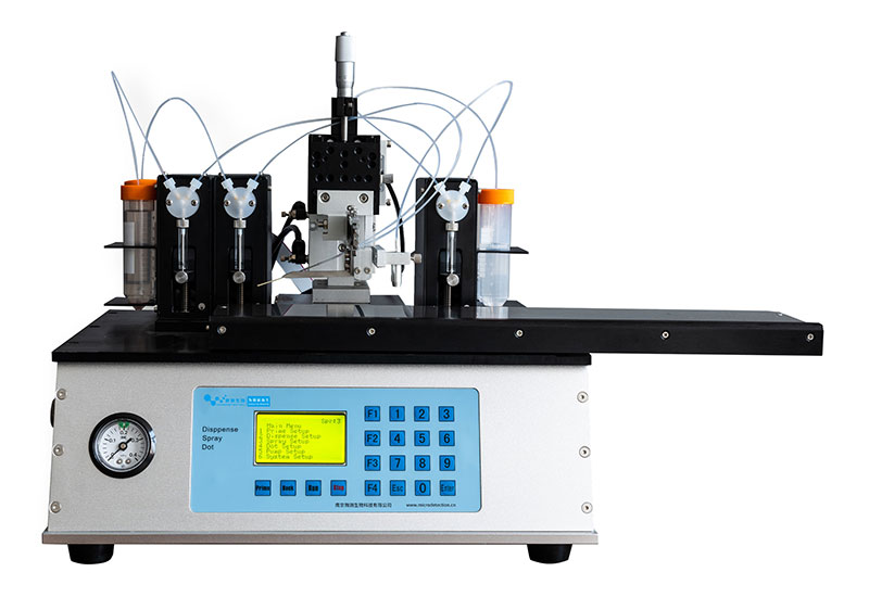 劃膜噴膜儀應(yīng)用于側(cè)向?qū)游鲈嚰垪l領(lǐng)域,主要劃線,噴金,噴點三大功能,可將檢測線和質(zhì)控線試劑噴涂到層析膜介質(zhì)上(例如硝酸纖維素膜),同時也可以將標(biāo)記物均勻,定量噴點到聚酯膜或玻璃纖維膜上的儀器,還可以在NC膜上噴點狀的抗原或抗體(多應(yīng)用于干化學(xué)或滲漏法)。使用進(jìn)口PEEK劃膜軟管將蛋白溶液印跡到層析膜表面,因使用的是軟管,柔韌性好,可有效降低劃痕對側(cè)向流動的標(biāo)記復(fù)合物形成的阻力,避免假陽性的發(fā)生。其工作原理是依靠步進(jìn)微量泵驅(qū)動,該儀器使用24000步的進(jìn)口步進(jìn)泵,出液精度控制在0.01ul,此劃線步驟無法用人工取代。